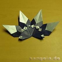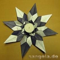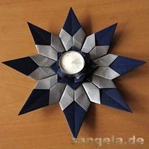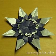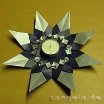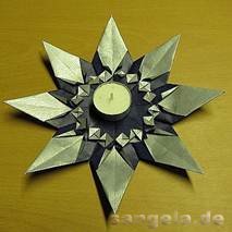 Восьмиконечная новогодняя звездочка может стать оригинальной подставкой для свечек. Эта новогодняя звезда может стать украшением новогодней ёлки или интерьера в школе, на работе или дома. Используя двухстороннюю цветную бумагу, пергамент или фольгу и изменяя форму углов можно изготавливать оригинальные поделки из бумаги, сделанные своими руками.
