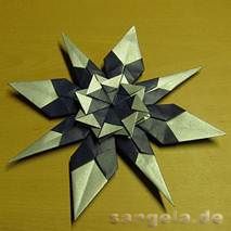 Восьмиконечную новогоднюю звездочку можно использовать как подставку для свечи. Используя различную бумагу, а также сделав различные сгибы в деталях, можно получить очень оригинальные и красивые звёздочки различных форм и расцветок.